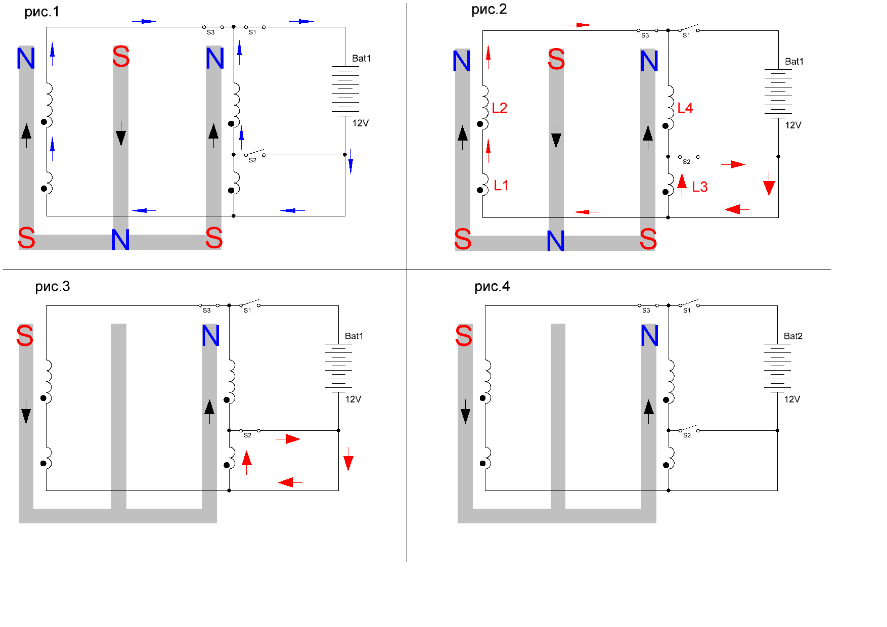 | Усложню или может упрощу предыдущий мой вопрос. На картинке четыре рисунка, это стадии намагничивания-размагничивания катушек на сердечнике типа «Ш». На рис1 намагничивание до какого-то момента, пока не столь важно до какого. Синие стрелки – направление тока источника по цепи. Черные стрелки – направление магнитных потоков в сердечнике. На рис2 красные стрелки -направление тока размагничивания, отключаем источник и закорачиваем L3 на себя на некоторое время, очень малое. Теперь просьба ко всем, помогите разобраться в какой момент и при какой коммутации рис3 или рис4 магнитный поток в крайней левой ветви сердечника развернется в обратную сторону как указано на рис3 и рис4. Чтобы в этой ветви он развернулся, в его катушке ток должен пойти в обратную сторону. Вот я никак и не соображу в какой момент это должно произойти.