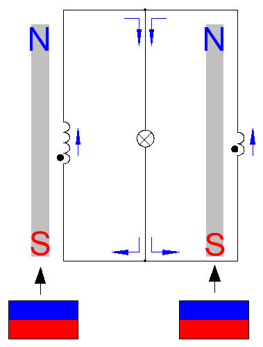 | Парни, думаю, что все кто хотел уже давно проверил и перепроверил варианты коммутации катушек. И убедились, что на приставленной рядом, съемной катушке, никакого превышения нет, нет даже равенства затраченного в первичных и полученного на съемной, ни при сравнении площадей амплитуд, ни при пересчете в энергии. Обидно, но думаю не смертельно. Есть мысля! Но чтобы понять не ошибся ли я, мне нужна ваша помощь. И что бы не было каши, буду вопрошать вас по частям. Значица так, лежат передо мной на столе два одинаковых сердечника (железо). На каждом одинаковым проводом, в одну сторону намотана обмотка. Катушки максимально удалены друг от друга для уменьшения взаимоиндукции. На первом(левом) 100 витков, а на втором(правом) 10 витков. Обмотки соединены встречно, т.е. начало левой с началом правой, конец левой с концом правой. Получившиеся две скрутки замыкаем между собой через лампочку. Сопротивление лампочки допустим всегда равно полному сопротивлению 10 витковой обмотки. Подносим к нижним торцам обеих катушек по магниту одинаковыми полюсами одновременно. В обеих обмотках появляется наведенный ток и так как в месте соединения верхних концов катушек ток встречный, он устремляется через лампочку к скрутке нижних концов катушек и так будет продолжаться пока приближение магнитов не остановится. А теперь вопрос, ток пойдет так как я описал или как-то по другому?