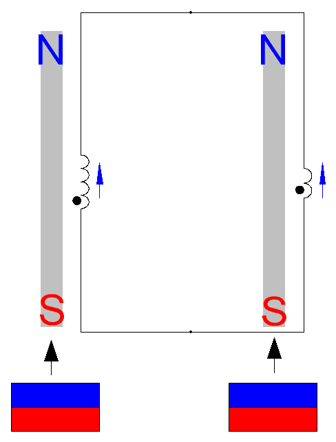 Поехали далее. Начинаем все снова, только теперь без перемычки с лампой, просто две катушки соединенные встречно. Как теперь пойдет ток от катушек на следующих временных участках: в самом начале приближения магнита, на границе полного перемагничивания сердечников и после этой границы?