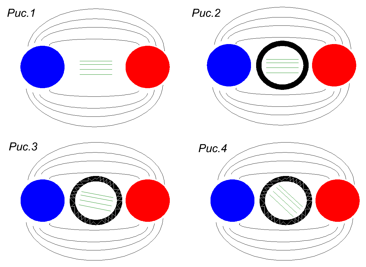 | Макс, ну вот так я вижу то, что происходит у меня на верстаке. Думаю, что это полностью совпадает с твоими словами. Теперь подробнее. Рис.1 - два противоположных периферийных керна, вид с верху, на керны подано питание и примитивным образом показаны силовые линии. В центре, зеленым, показаны тоже силовые линии, я выделил их не случайно, они нарисованы не совсем так как есть на самом деле, сделал это в следствие отсутствия времени на прорисовку и в угоду наглядности. Рис.2 - все тоже самое, добавляем только кольцевой сердечник в центр, между периферийными. Можно, а скорее всего и нужно не кольцо а типа трубы. Хотя, думаю, что и несколько колец набором можно. При подаче питания на периферийные, силовые линии в центре остаются в том же положении как и на предыдущем рисунке. Рис.3 - то же самое, только добавляем спиральную обмотку на центральный кольцевой сердечник. Прошу прощения, что обмотка не получилась красивой. Подаем питание на периферийные и видим несколько необычную картину, силовые линии проходящие через внутреннюю область кольцевого сердечника искривляются, а по простому - поворачиваются. Рис.4 - то же, что и на Рис.3, линии продолжают искривляться (поворачиваться) до тех пор, пока в спиральной (центральной) обмотке нарастает ток. Дальше принципом бегущих огней (для периферийных) мы заставляем "крутиться" силовые линии (поле) в середине центрального кольцевого сердечника. По большому счету получается генератор Грамма. Твой ход Макс...