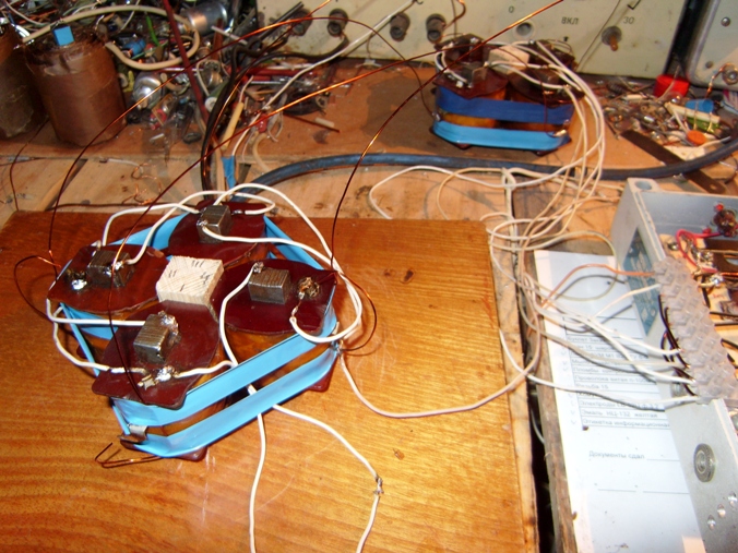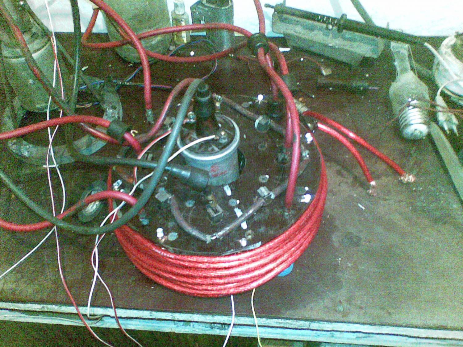 | Сегодня проводили первые испытания этой страшной машины. Схема коммутации катушек как на схеме s_chechel . Вокруг устройства возникает электростатическое поле как при работе тр-а Тесла. Рядом расположенные металлические предметы искрят при поднесении к ним куска провода.Телевизор расположенный в 6 метрах от устройства "сходил с ума". Со вторичной обмотки также шурует высокое напряжение но без тока . Намотали еще одну обмотку вокруг всех кернов многожильным кабелем с толстой изоляцией в два слоя (10 метров). При прикосновении к оголенному концу провода этой обмотки вдарило так, что рука тряслась около часа. Но токовой составляющей на ней тоже нет. Может быть съем нужно делать как в Хаббарде-Магнето с центральным керном ?