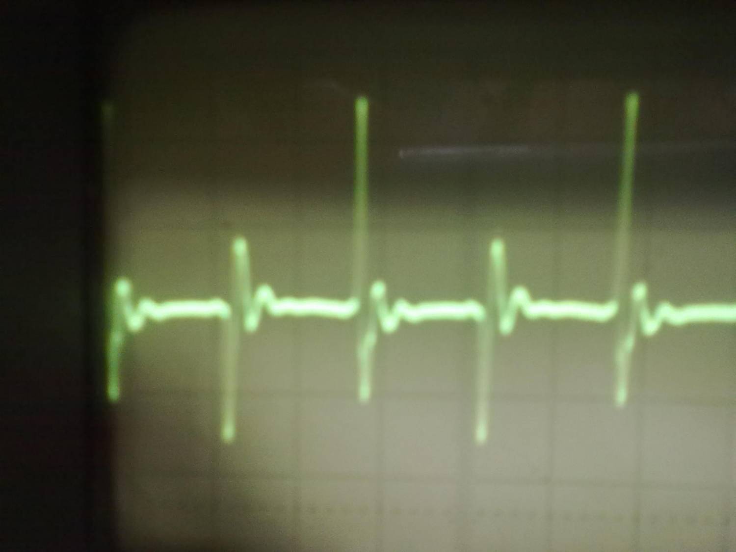 | Увеличиваем частоту до 5 кГц (больше пока не получается), импульсы накладываясь на хвосты соседних увеличиваются по амплитуде, скорее всего за счёт более быстрого перемагничивания. Лампа горит ярче но не в полный накал, что странно, ведь амплитуда по осциллографу 25-30 Вольт. На картинке 0,2мсек\дел. Да, катушки 117-е.