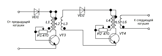 Единственное условие правильной работы схемы выдача БГ одного импульса на один импульс ОЭДС. Соединяя катушки последовательно через ФИ, получим последовательность импульсов. Первый импульс — запускающий, энергозатратный, от генератора. Остальные это последовательность импульсов, на которые энергия от источника питания не расходовалась. Как пример можно привести линейку поставленных на «попа» кирпичей. Толкнем первый кирпич. Падая, он толкнёт второй и так далее. Если интересно посмотрите видео по адресу: https://www.youtube.com/watch?v=EI_V16TZmII Для проверки был собран макет из 4-х катушек, соединенных через ФИ (смотри схему). Первая катушка подключена к генератору импульсов. На остальных катушках осциллографом наблюдались импульсы, постепенно уменьшающейся амплитуды. Уменьшение амплитуды импульсов не превышает 10% от катушки к катушке. Итак: мы научились создавать цепочку катушек, в каждой из которых поочередно возникает магнитное поле. Своего рода «цепную реакцию» по длине цепи.